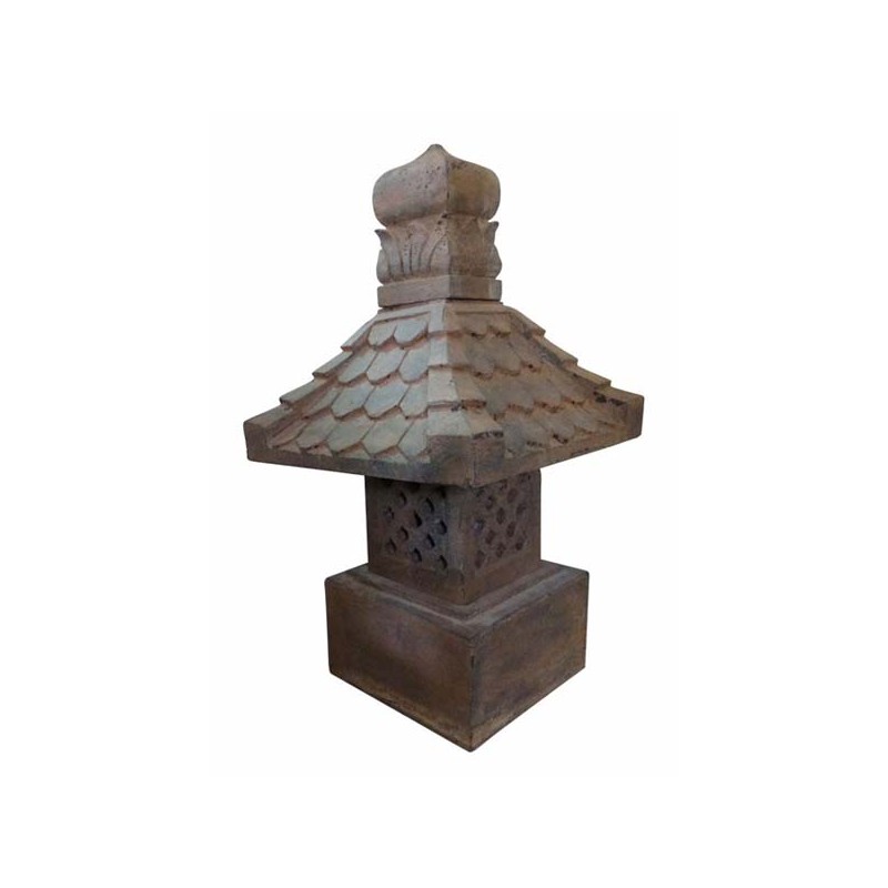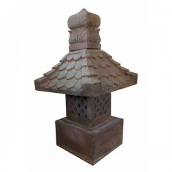 Reconstructed stone garden lamp, the lower part of witch is perforated, allowing the installation of an electrically powered equipment.